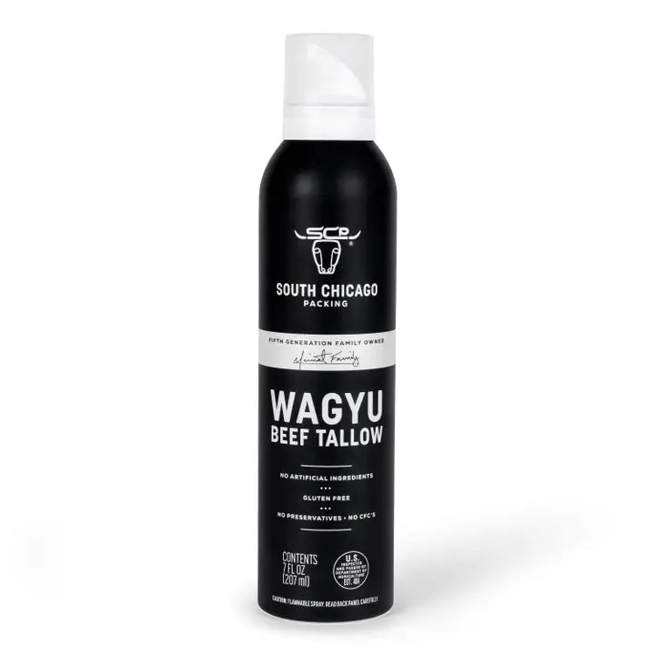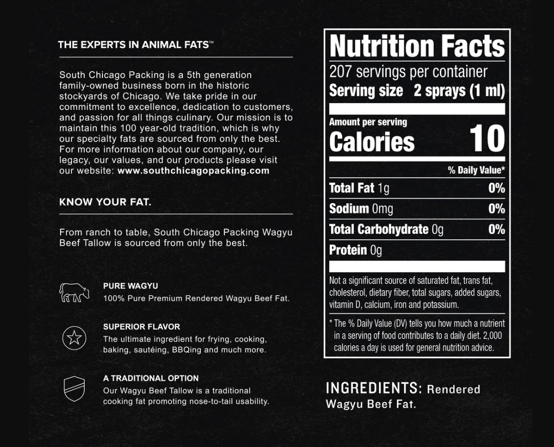 From ranch to table, South Chicago Packing's Wagyu Beef Tallow is sourced from only the best. This product is 100% pure premium rendered American Wagyu beef fat – Now in a convenient, nonstick spray! This is the ULTIMATE ingredient for BBQ-ing, grilling, searing, sautéing, and much, much more!